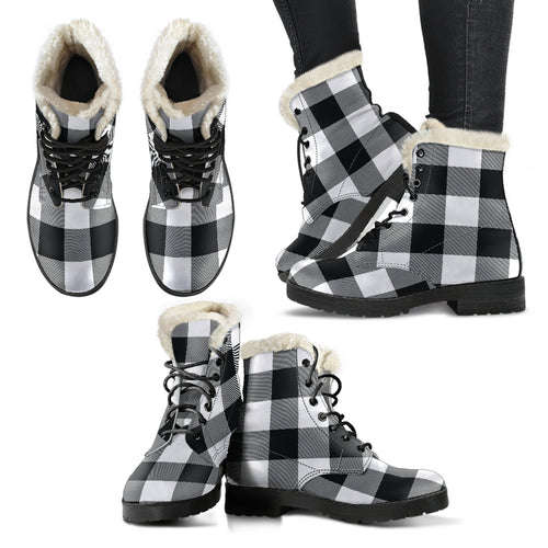 Black and White Buffalo Plaid Faux Fur Lined Vegan Leather Boots