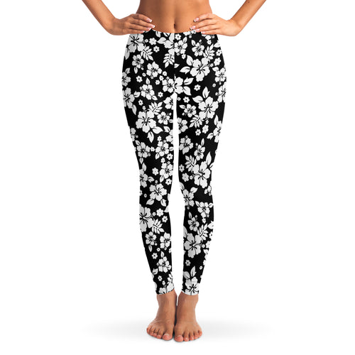 Black and White Hibiscus Flower Hawaiian Pattern Leggings XS - XL Squat Proof