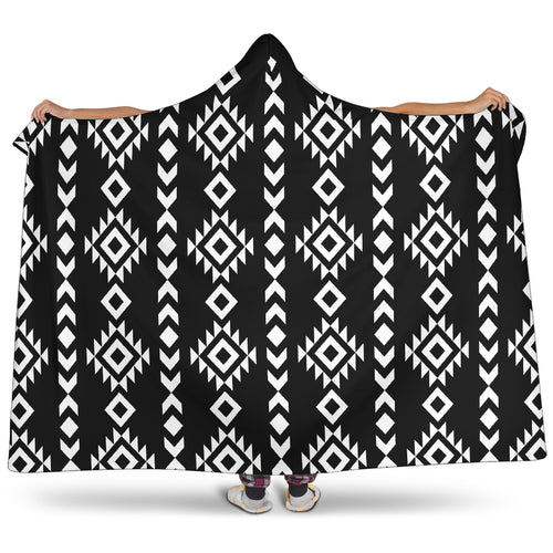 Black and White Ethnic Pattern Tribal Hooded Blanket With Sherpa Lining