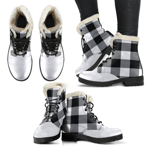 Black White Buffalo Plaid Color Block Vegan Leather Faux Fur Lined Winter Boots With White Toe