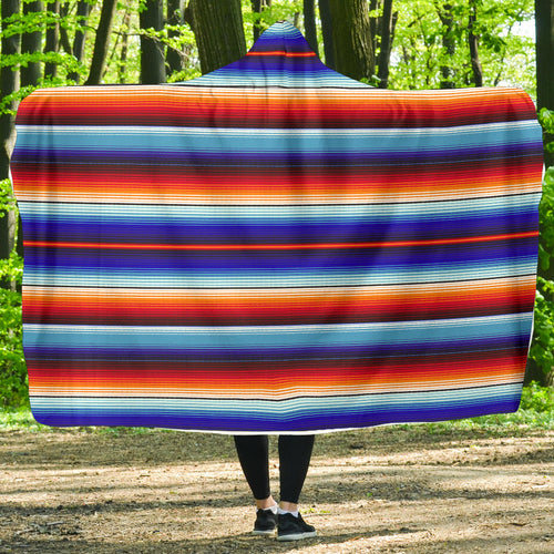 Blue and Orange Serape Style Striped Hooded Blanket With Fleece Lining
