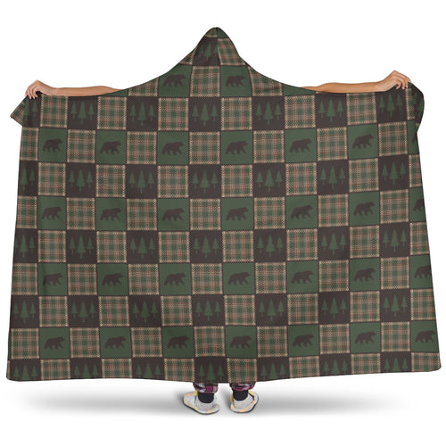 Brown and Green Plaid With Bears Patchwork Hooded Blanket