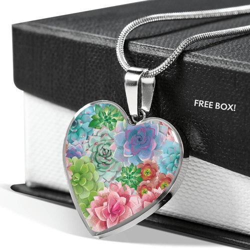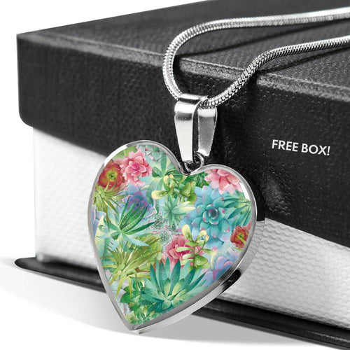 Succulents on Heart Shaped Stainless Steel Pendent Jewelry Necklace With Gift Box and Chain Colorful and Lush Design