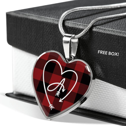 Custom Arrow Heart Monogram on Red Buffalo Plaid Heart Shaped Pendant Jewelry Necklace In Stainless Steel or 18K Gold Finish