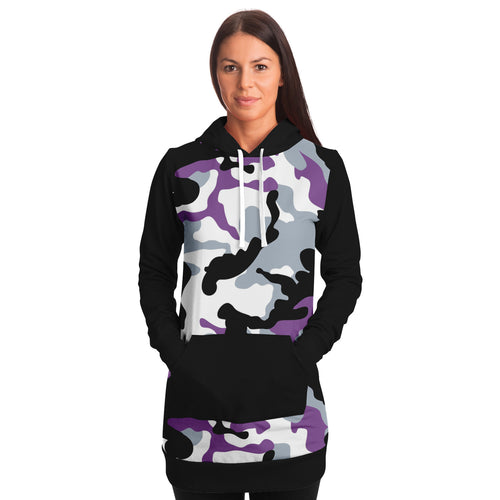 Purple and Black Camouflage Longline Hoodie Dress With Solid Black Sleeves, Pocket and Hood