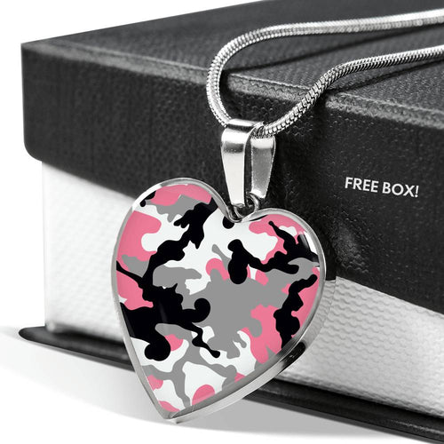 Rose Pink, Gray, Black and White Camouflage Heart Shaped Stainless Steel Pendant Necklace