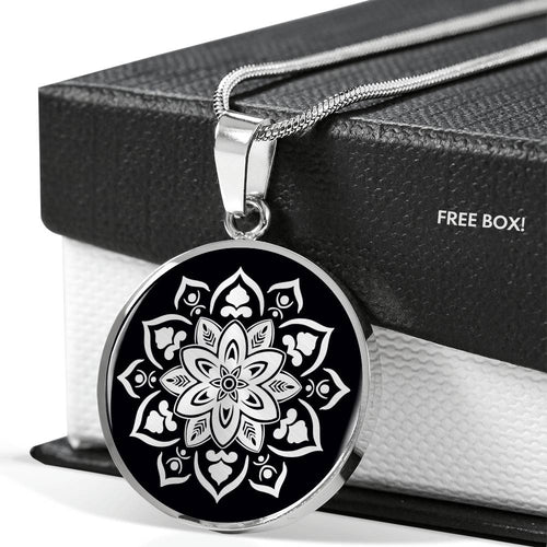 Black With Mandala Flower Design Circle Round Pendant In Stainless Steel or 18K Gold Finish