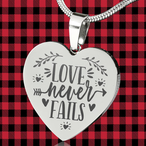 Love Never Fails Heart Shaped Pendant Necklace Engraved Surgical Stainless Steel With Chain and Gift Box