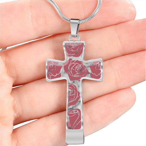 Rosey Pink Roses on Faux Marble Cross In Stainless Steel or 18K Gold Finish With Chain Necklace and Gift Box