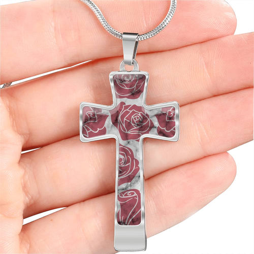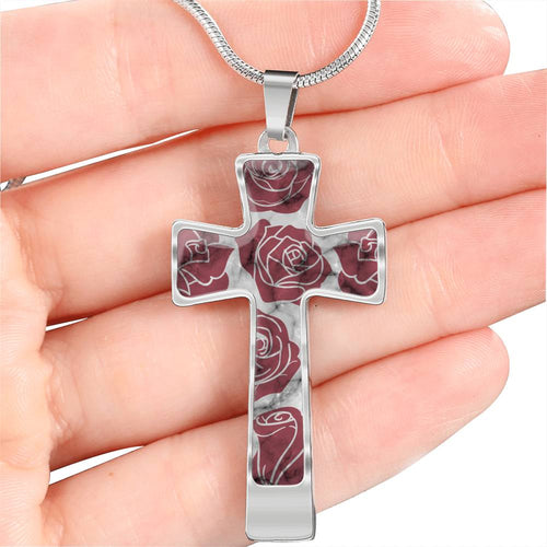 Dark Pink Roses on Faux Marble Cross In Stainless Steel or 18K Gold Finish With Chain Necklace and Gift Box
