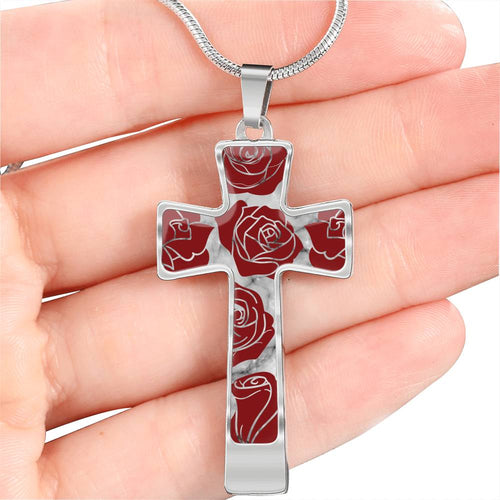 Red Roses on Cross Pendant Necklace White Faux Marble In Stainless Steel or 18K Gold Finish With Chain and Gift Box