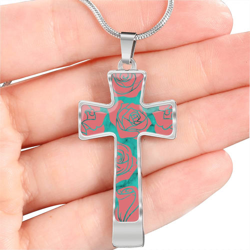 Roses on Teal Faux Marble With Roses Cross Pendant Necklace In Stainless Steel or 18K Gold Finish With Chain and Gift Box